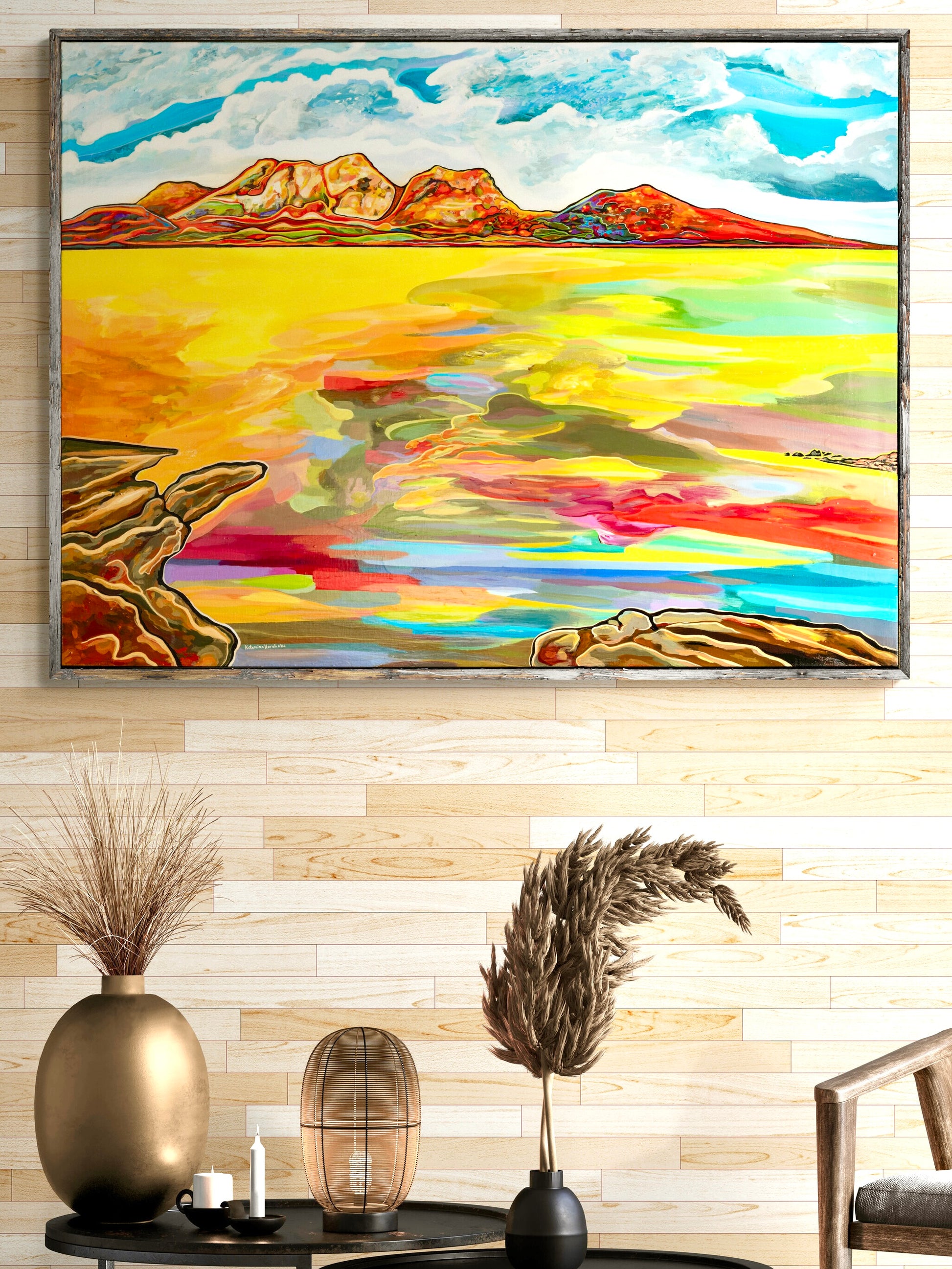 The Hazards is a breathtaking mountain range located within Freycinet National Park on Tasmania's eastern coast. Located between Coles Bay and Wineglass Bay, they are said to have been named after local whaler Captain Richard Hazard, who had African-American heritage. The range consists of five notable peaks: Mayson (415 m), Amos (454 m), Dove (485 m), Baudin (413 m), and Parson (331 m). When I first saw the hazards, to me, they looked like an island of mountains out to sea, unlike anything I had seen before, and I thought myself ‘wow, I need paint them!”. I was also captivated by their intricate pink granite formations, sometimes tinged with red, and I painted them in fiery oranges and reds to capture their stunning beauty during sunset.