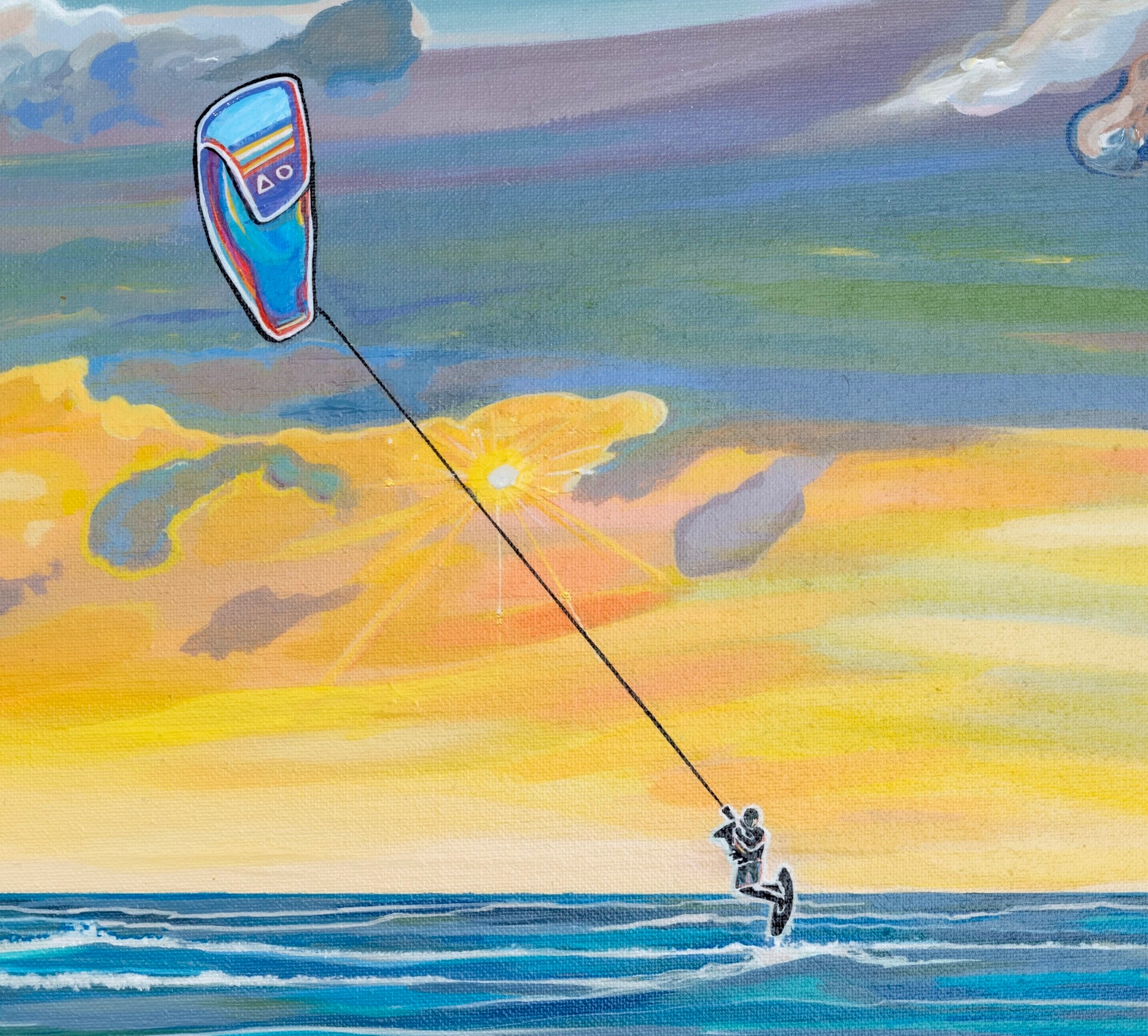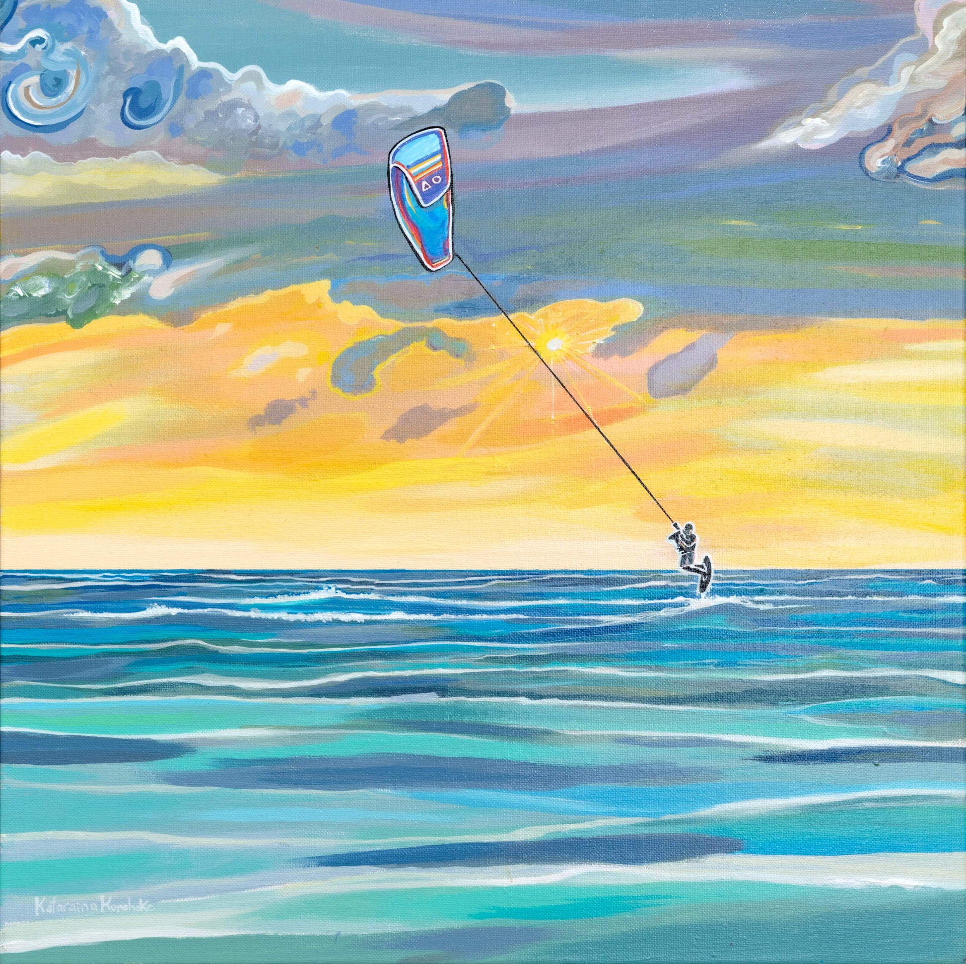 During these walks, I often had the pleasure of witnessing kite surfers in action, I became captivated by their skill which inspired me to create this painting.