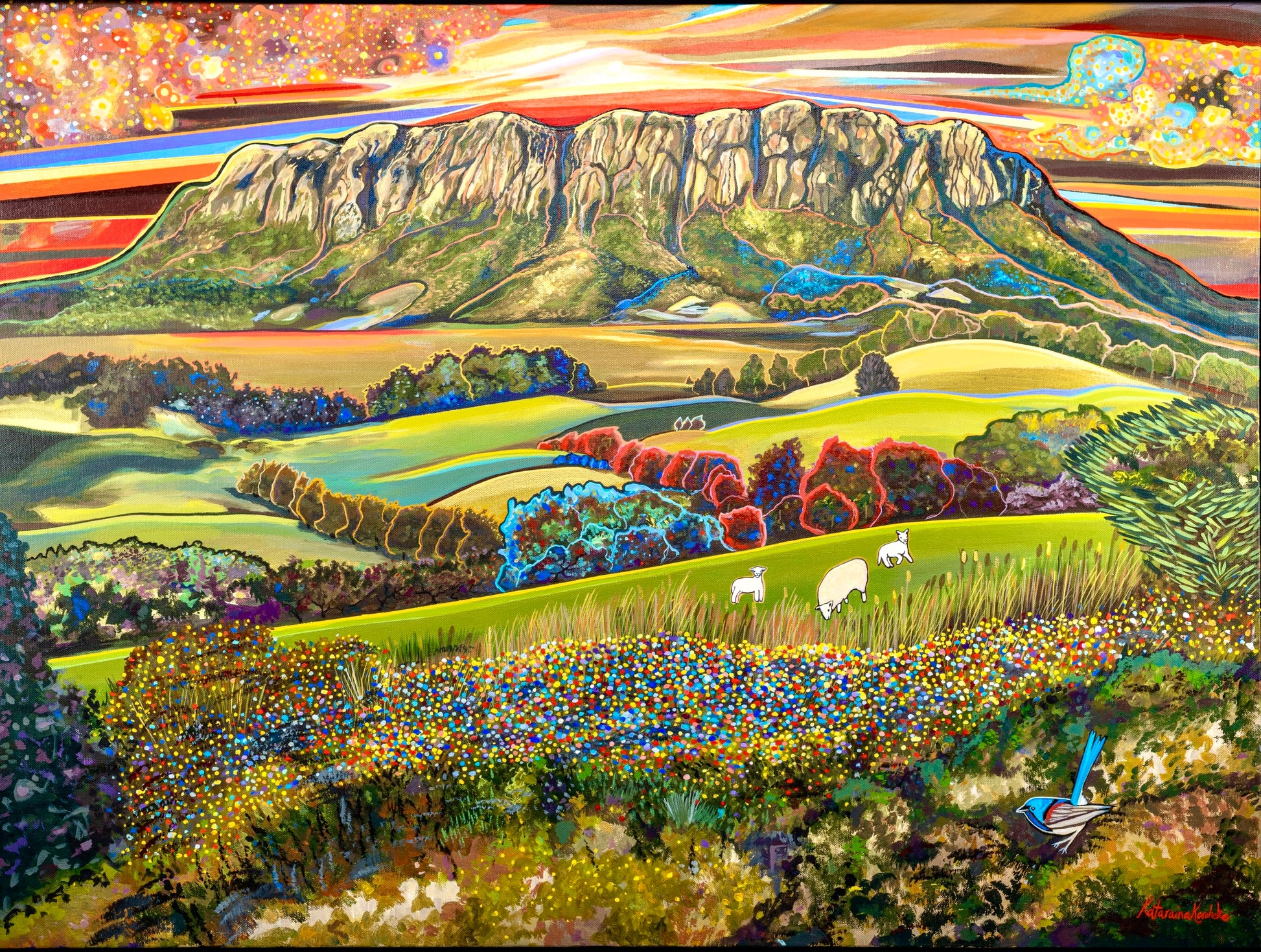 Inspired by Mt Roland, a beloved Tasmanian landmark near Devonport. Mt Roland has been a part of my life since I was a young child, and she continues to captivate me with every passing glance. We often stop along the country side roads surrounding Mt Roland to view her monolithic stature, it’s one of my favourite places to stop - adorned with ever-changing cloud-scapes, sunsets, rain, snow, fog or sunshine – we always see her in a new light. However, I chose to portray Mt Roland with her brilliant spring time colours and with the beautiful farmland that surrounds it.