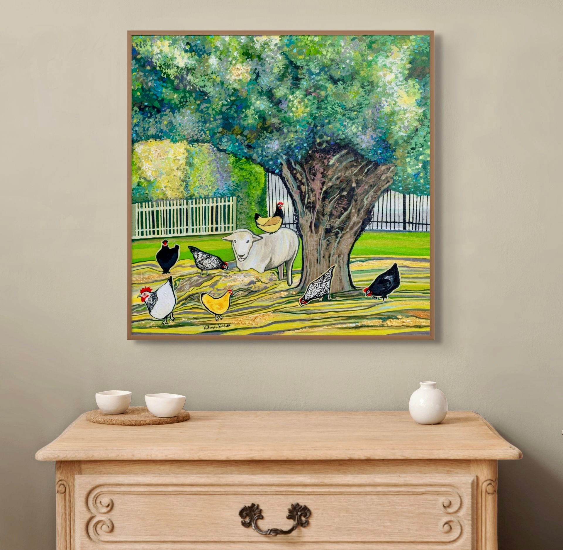 Meet Gerald and the chickens, a delightful group of fluffy creatures that bring joy to my life. It all began one evening when Terry and I decided to unwind at the Prince Of Whales Pub. As we were enjoying our beers out front, a farmer asked "Would you like a friend?" and pulled out from inside his ute a tiny two-day-old orphan lamb, Terry and I couldn't resist and brought the lamb home. Now, Gerald has grown into a spirited sheep loved by us and enjoyed by everyone who passes by, often seeing him happily grazing in the front yard.