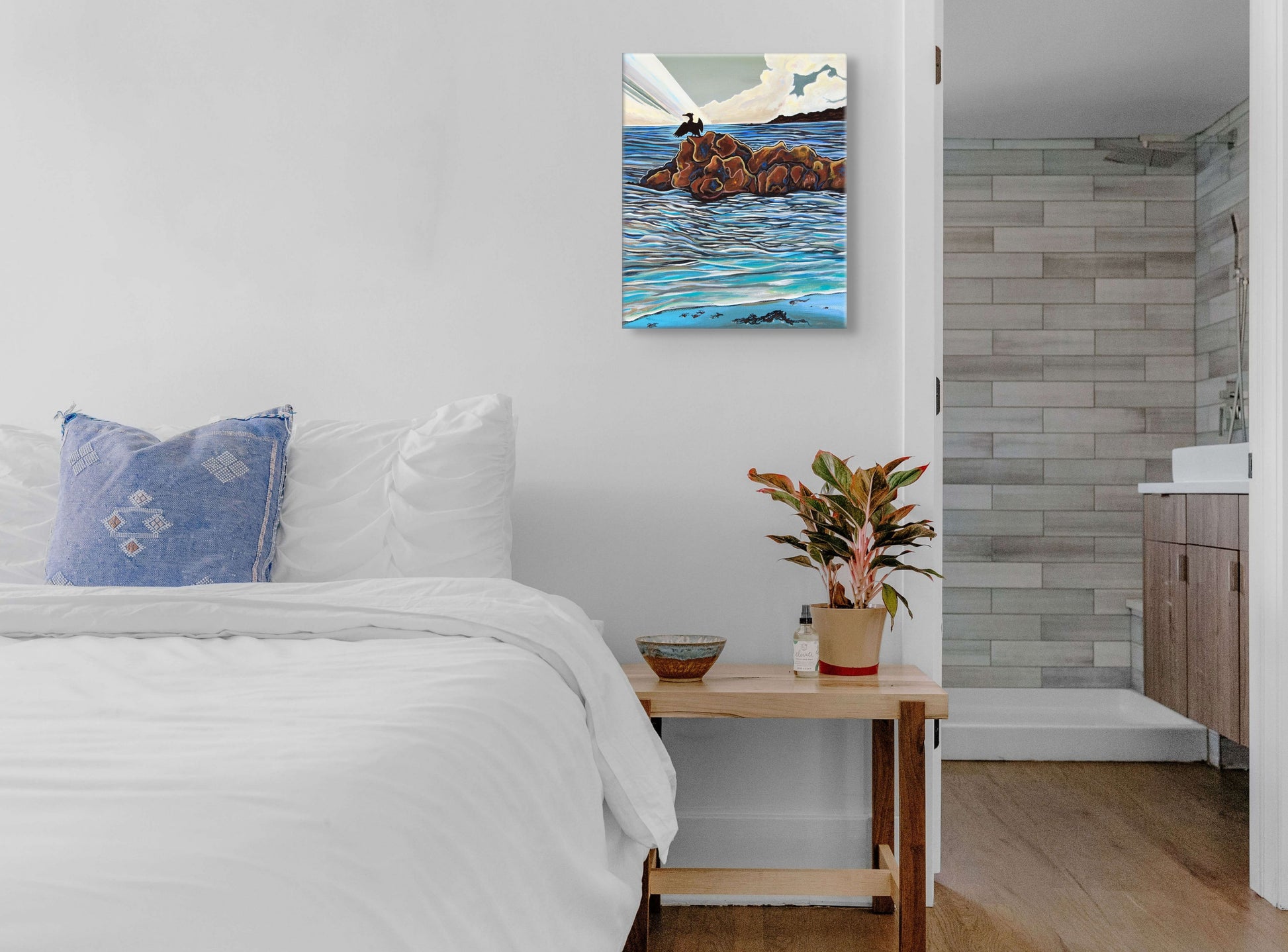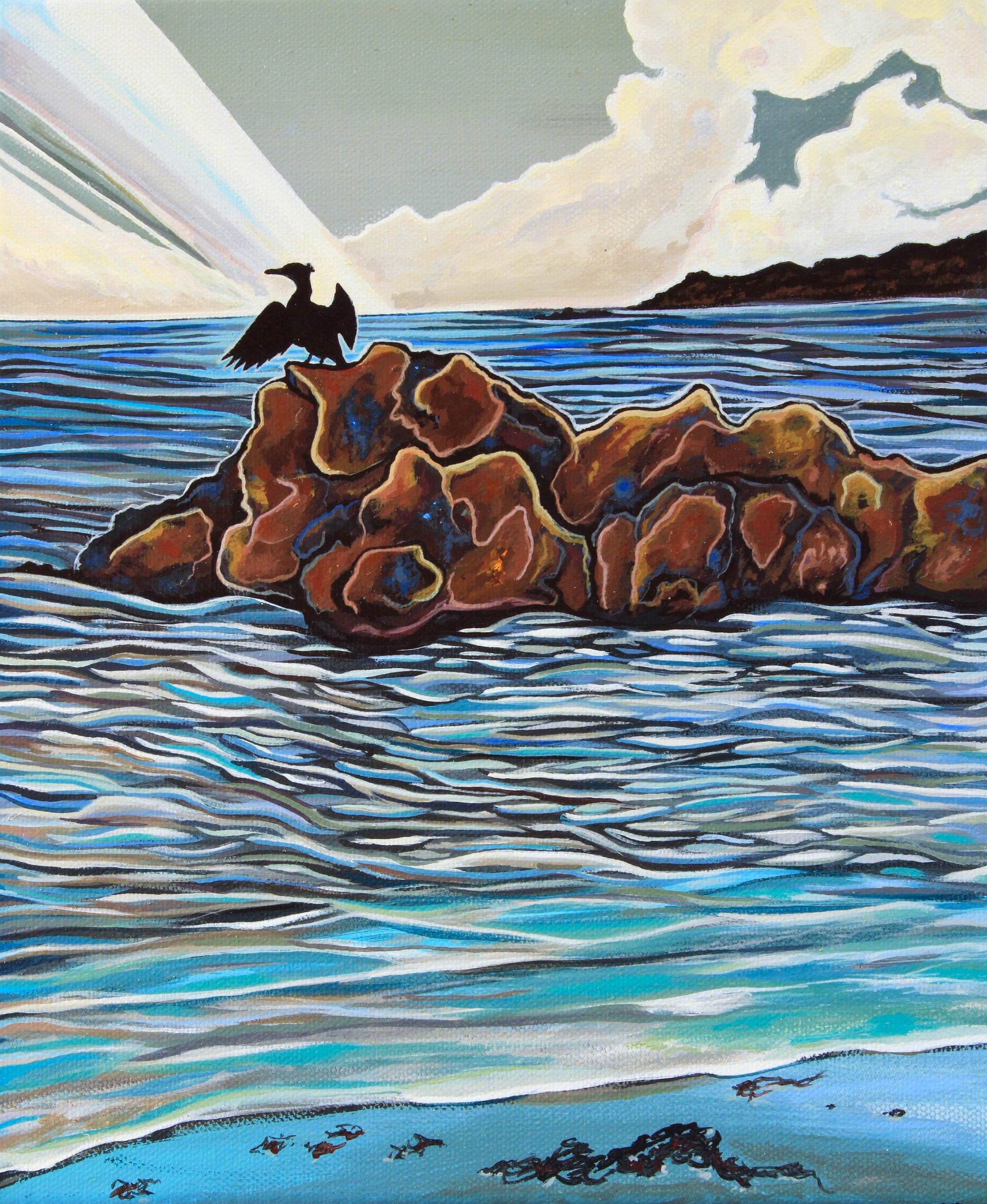 Capturing a black cormorant perched on a rock at Sisters Beach. With its wings elegantly spread, the bird appears to be enjoying the gentle caress of the ocean breeze. The artwork beautifully portrays this scene of tranquility and grace.