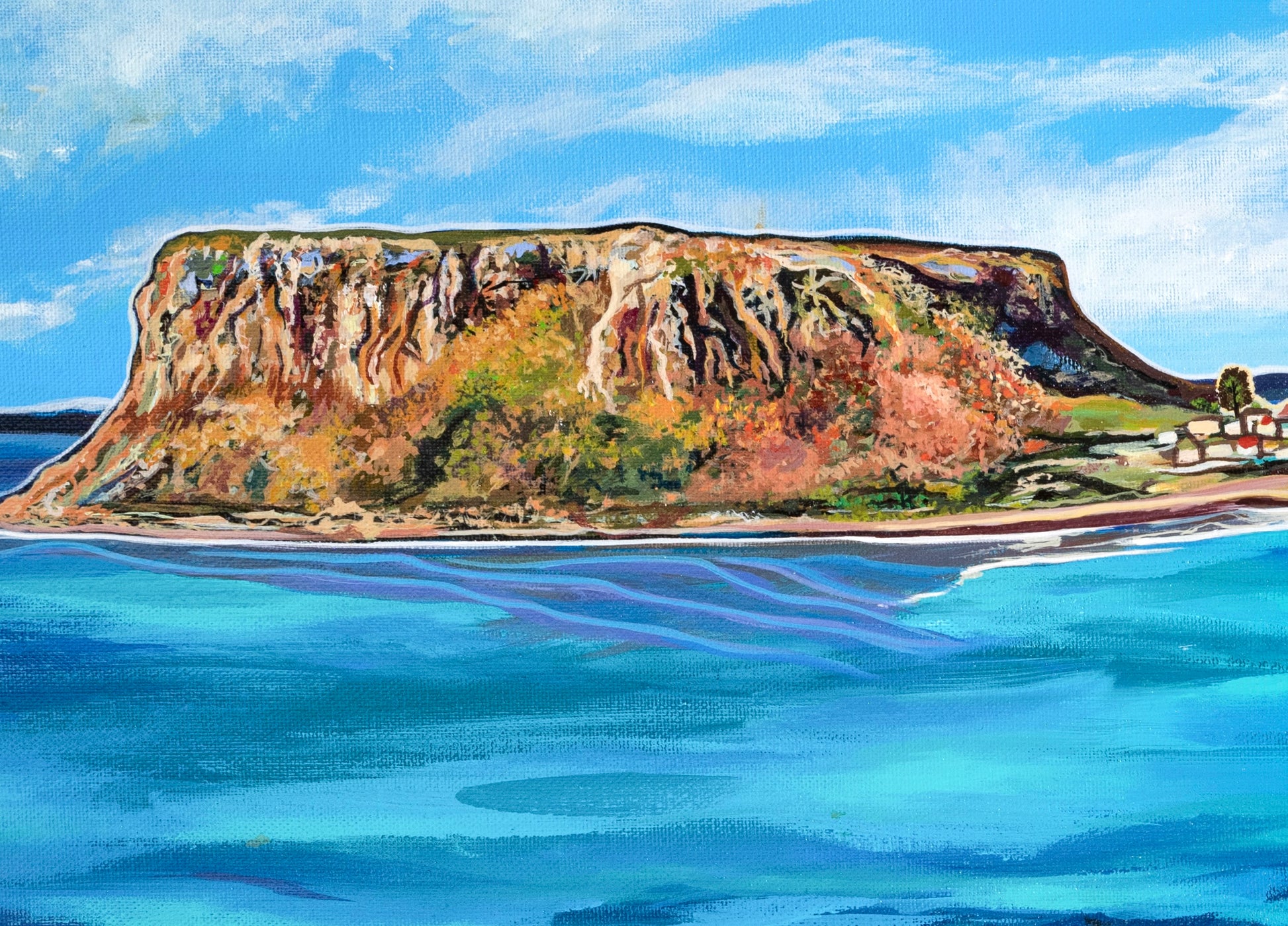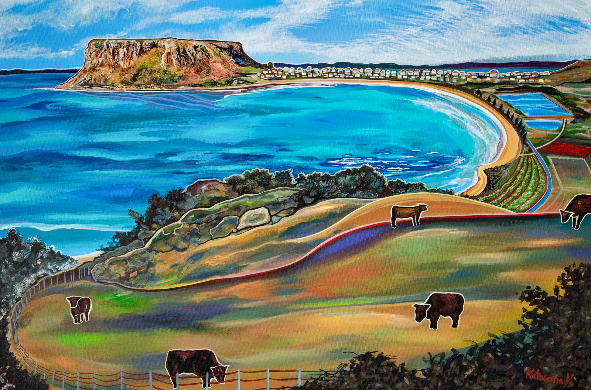 Stanley's iconic landmark, 'The Nut,' was born from the pleasure of a leisurely drive along the picturesque west coast of Tasmania. The organic contours of the bay, accompanied with quaint little houses nestled amidst sprawling farmland, perfectly complements the majestic presence of this magnificent rock formation. 'The Nut' holds immense significance as a beloved Tasmanian icon, and I couldn't be more delighted to have captured its essence in this artwork, aptly titled 'The Cows Are Happy’ because the cows appear content as they graze upon lush green pastures amidst breathtaking views.