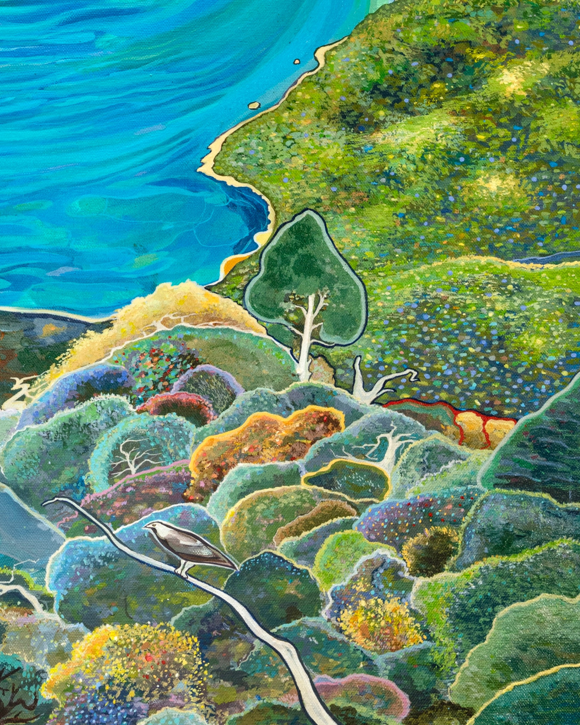 Reflecting on our first Wineglass Bay holiday from eight years ago, I fondly remember spotting a big brown wombat in the car park when we first rolled up - there were a few tourists standing around, taking photos of the wombat, and it seemed quite unbothered by it, which I found funny. Then we began our descent down the millions of stairs to the beach where we camped in the bushes alongside the large coastal rocks. In a humorous twist, we bumped into Greens Senator Bob Brown - there I was, standing around in my bikini top, having a quick chat with him! Anyway, I aimed to capture the wombat in my painting because it still stands out to me till this day, and I decided to add a baby wombat for extra charm—who doesn't love baby wombats? I also wanted to depict how vibrant the water's blue was when I swam in Wineglass Bay; it was a stunning turquoise on a sunny day, and incredibly refreshing! I strolled along the entire length of the beach, climbed the coastal rocks, sunbathed, and chatted with tourists,